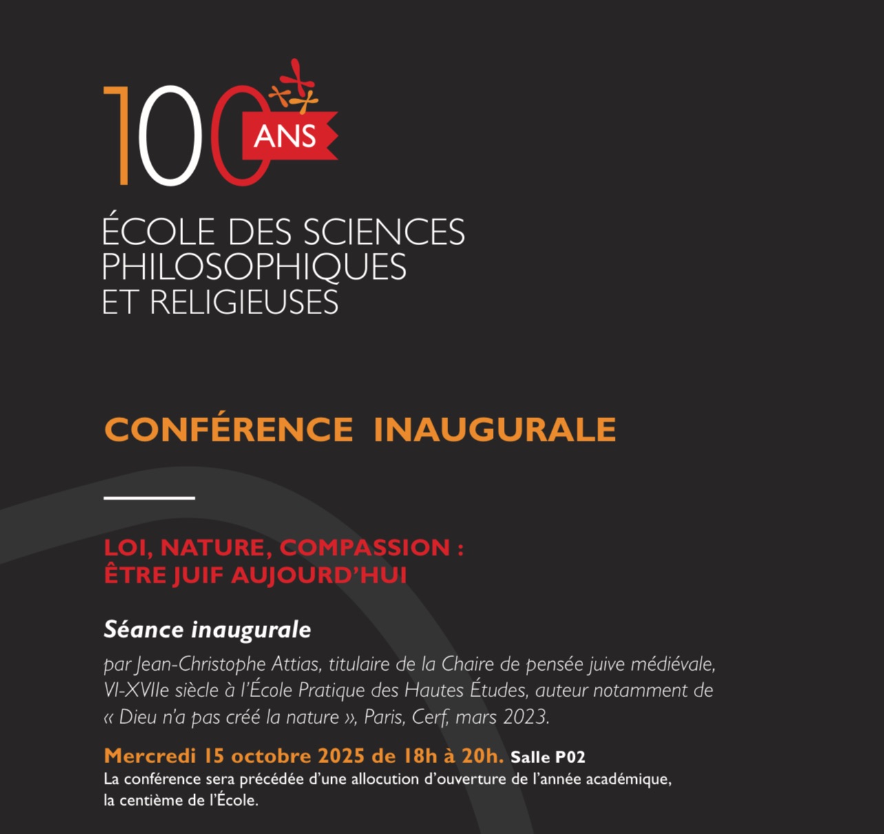 Loi, nature, compassion. Être juif aujourd’hui Conférence de Jean-Christophe Attias (EPHE/PSL, Paris) 15 octobre 2025 École des sciences philosophiques et religieuses (Bruxelles) Lire l’intégralité du texte de cette conférence sur Academia.edu.